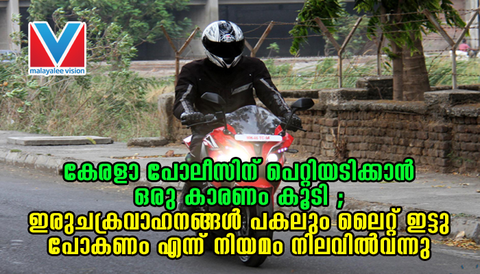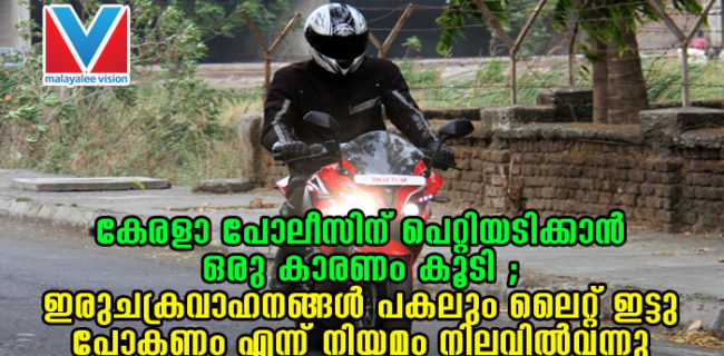 കേരളാ പോലീസിന് പെറ്റിയടിക്കാന് ഒരു കാരണം കൂടി ; ഇരുചക്രവാഹനങ്ങള് പകലും ലൈറ്റ് ഇട്ടു പോകണം എന്ന് നിയമം നിലവില്വന്നു
