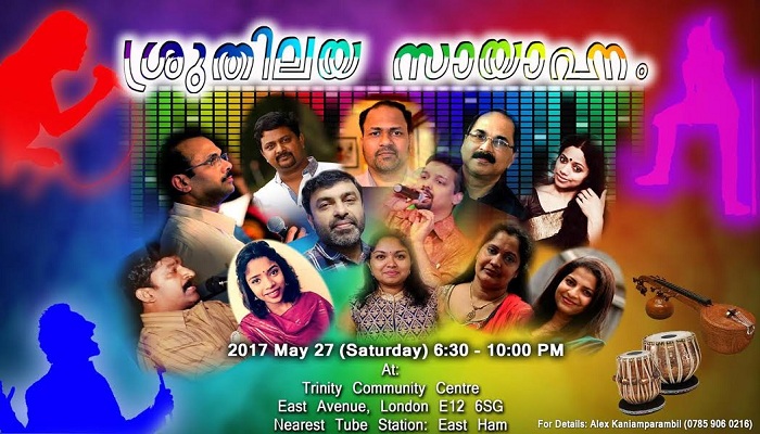 ഈ വരുന്ന ശനിയാഴ്ച്ച ,മെയ് മാസം 27-ന്, വൈകീട്ട് 6.30 മുതല് രാത്രി 10 മണി വരെ, ഈസ്റ്റ് ലണ്ടനിലുള്ള ട്രിനിറ്റി കമ്യൂണിറ്റി സെന്ററിലെ ഓഡിറ്റോറിയത്തില് വെച്ചാണ്, ശ്രുതിലയ സായാഹ്നം അരങ്ങേറുന്നത് …