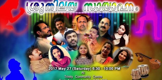 ഈ വരുന്ന ശനിയാഴ്ച്ച ,മെയ് മാസം 27-ന്, വൈകീട്ട് 6.30 മുതല് രാത്രി 10 മണി വരെ, ഈസ്റ്റ് ലണ്ടനിലുള്ള ട്രിനിറ്റി കമ്യൂണിറ്റി സെന്ററിലെ ഓഡിറ്റോറിയത്തില് വെച്ചാണ്, ശ്രുതിലയ സായാഹ്നം അരങ്ങേറുന്നത് …