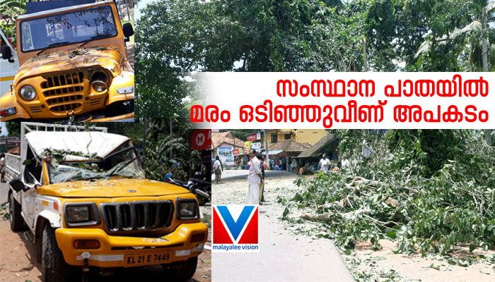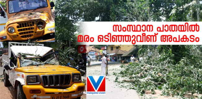നെടുമങ്ങാടിനു സമീപം സംസ്ഥാന പാതയില് മരം ഒടിഞ്ഞു വീണ് അപകടം, രണ്ടു വാഹങ്ങള് തകര്ന്നു.