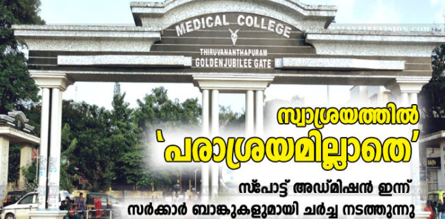 സ്വാശ്രയത്തില് ‘ആശ്രയമില്ലാതെ’… സ്പോട്ട് അഡ്മിഷന് ഇന്ന്; ബാങ്ക് ഗ്യാരണ്ടി സംബന്ധിച്ച് ഇന്ന് സര്ക്കാര് ബാങ്കുകളുമായി ചര്ച്ച