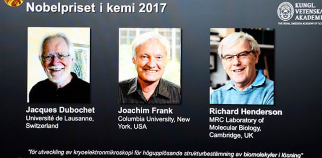 സ്റ്റോക്ക്ഹോം:ഈ വര്ഷത്തെ രസതന്ത്ര നൊബേല് പ്രഖ്യാപിച്ചു. സ്വിറ്റ്സര്ലന്ഡുകാരനായ ജാക്വസ് ദുബോഷെ, അമേരിക്കക്കാരനായ ജവോഷിം ഫ്രാങ്ക്, യുകെയില് നിന്നുള്ള റിച്ചാര്ഡ് ഹെന്ഡെര്സണ് എന്നിവര് പുരസ്കാരം പങ്കിട്ടു.