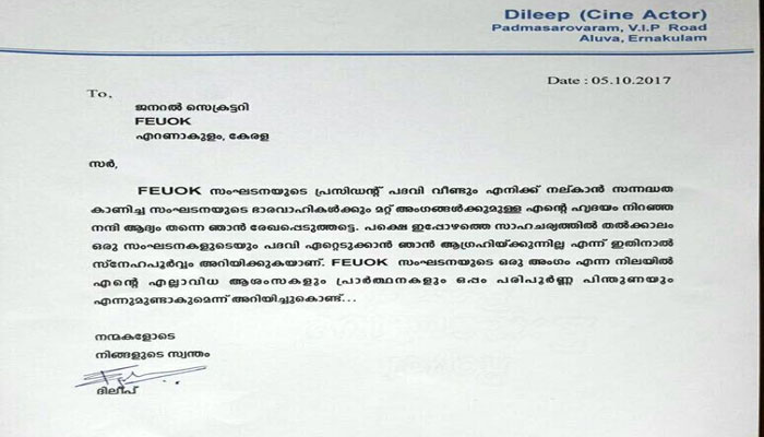 ജാമ്യം ലഭിച്ചതിന് പിന്നാലെ ദിലീപ് ഫ്യൂയോകിന്റെ പ്രസിഡന്റ് സ്ഥാനത്തേയ്ക്ക് തിരിച്ചെത്തുമെന്ന് നിലവിലെ പ്രസിഡന്റ് ആന്റണി പെരുമ്പാവൂര് അറിയിച്ചിരുന്നു. നടി ആക്രമിക്കപ്പെട്ട കേസില് അറസ്റ്റിലായതിന് പിന്നാലെ അമ്മ, ഫ്യൂയോക് തുടങ്ങിയ സംഘടനകളില് നിന്ന് ദിലീപിനെ പുറത്താക്കിയെന്ന വാര്ത്തകള് വന്നിരുന്നു.