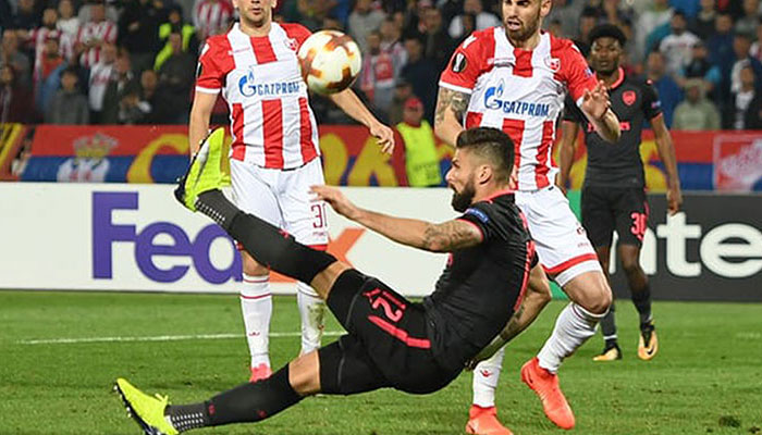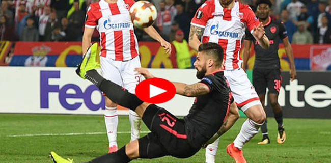മത്സരത്തിന്റെ 85ാം മിനുട്ടില് മനോഹരമായ പാസിംഗ് ഗെയിമിനൊടുവിലാണ് ജിറൗഡ് അത്ഭുത ഫിനിഷിംഗ് നടത്തിയത്.റെഡ് സ്റ്റാറിന്റെ പെനല്റ്റി ബോക്സിലേക്ക് ജാക്ക് വില്ഷെയറും തിയോ വാല്ക്കോട്ടും ചേര്ന്ന് പാസ് ചെയ്തുകൊണ്ടുവന്ന പന്ത് ജിറൗഡ് ഓവര് ഹെഡ് വോളിയിലൂടെ പോസ്റ്റിന്റെ മൂലയിലേക്കെത്തിക്കുകയായിരുന്നു. മത്സരം ആഴ്സണല് 10ന് ജയിച്ചു. യൂറോപ്പ ലീഗ് ഗ്രൂപ്പ് എച്ചിലെ മൂന്ന് മത്സരങ്ങളില് മൂന്നിലും ജയിച്ച ആഴ്സണലാണ് ഒന്നാമത്.