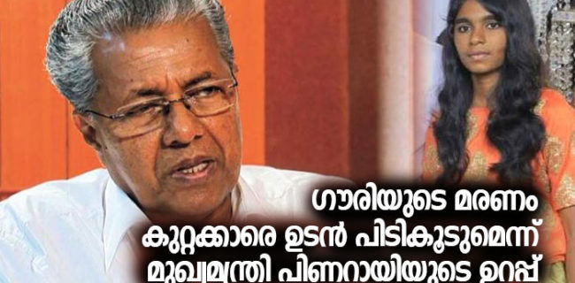 ഗൗരിയുടെ മരണം; കുറ്റക്കാരെ ഉടന് പിടികൂടുമെന്ന് മുഖ്യമന്ത്രി പിണറായിയുടെ ഉറപ്പ്
