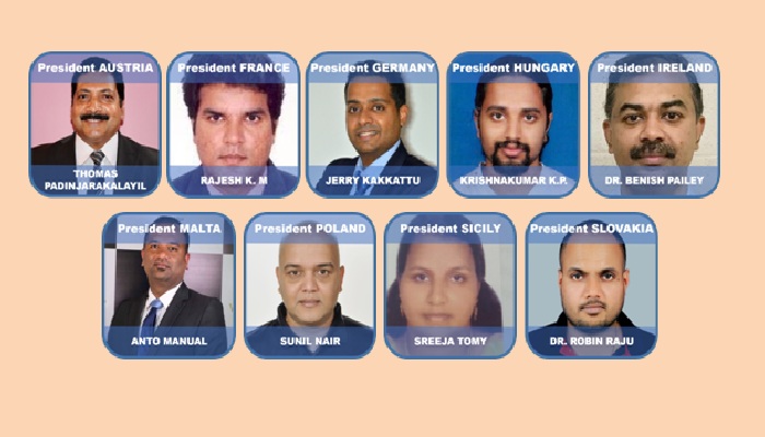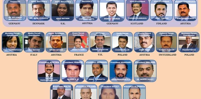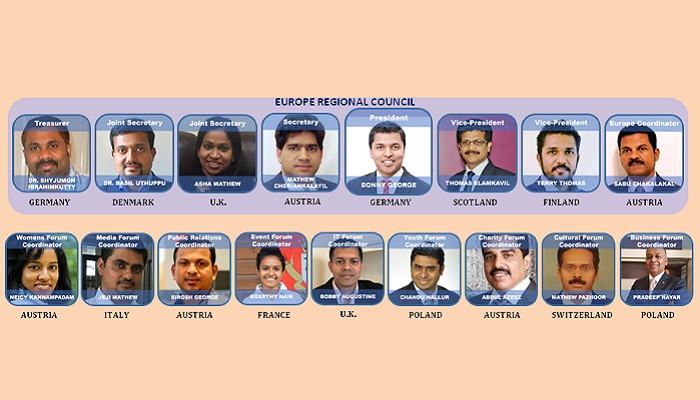 ഡോണി ജോര്ജ് (പ്രസിഡന്റ്, ജര്മനി), മാത്യൂസ് ചെരിയന്കാലയില് (സെക്രട്ടറി, ഓസ്ട്രിയ), ഡോ. ഷൈജുമോന് ഇബ്രാഹിംകുട്ടി (ട്രെഷറര്, ജര്മനി), സാബു ചക്കാലയ്ക്കല് (കോഓര്ഡിനേറ്റര്, ഓസ്ട്രിയ), വൈസ് പ്രെസിഡന്റുമാരായി ടെറി തോമസ് (ഫിന്ലന്ഡ്), തോമസ് ഇളങ്കാവില് (സ്കോട് ലന്ഡ്), ജോയിന്റ് സെക്രട്ടറിമാരായി ഡോ. ബേസില് ഉതുപ്പ് (ഡെന്മാര്ക്), ആഷ മാത്യു (യു.കെ) എന്നിവരെയും ഓസ്ട്രിയയില് നിന്നുള്ള നൈസി കണ്ണമ്പാടം വിമിന്സ് ഫോറം കോര്ഡിനേറ്ററും ഇറ്റലിയില് നിന്നുള്ള ജെജി മാത്യു മീഡിയ ഫോറം കോര്ഡിനേറ്ററായും, ഫ്രാന്സില് നിന്നുള്ള കീര്ത്തി നായര് ഇവന്റ് ഫോറം കോര്ഡിനേറ്ററായും യൂറോപ്പ് റീജണല് എക്സിക്യൂട്ടീവ് കമ്മിറ്റിയിലേക്ക് തിരഞ്ഞെടുത്തു.