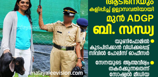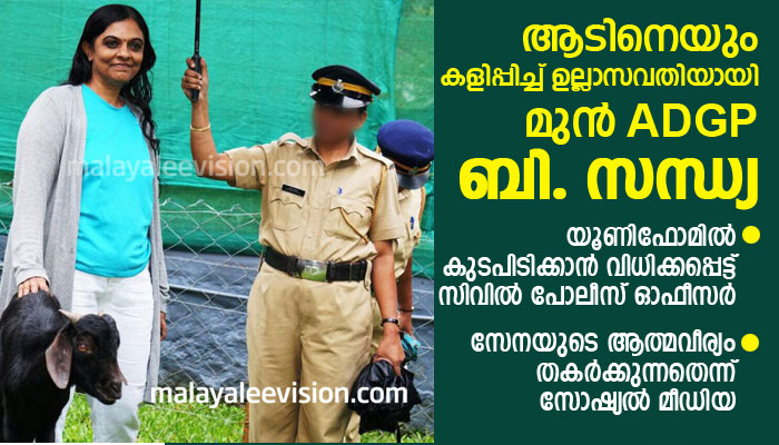 ബി. സന്ധ്യയെ ദക്ഷിണ മേഘല ADGP സ്ഥാനത്തുനിന്ന് പോലീസ് ട്രെയിനിങ് കോളേജില് അഡീഷണല് ഡിറക്ടറായി സ്ഥാനചലനം നടന്നതിന് തൊട്ടു പിന്നാലെ കീഴുദ്യോഗസ്ഥയെ കൊണ്ട് കുടപിടിപ്പിച്ച് ആടിനെയും കളിപ്പിച്ച് ഫോട്ടോക്ക് പോസ് ചെയ്യുന്ന ബി. സന്ധ്യയുടെ ചിത്രങ്ങള് സോഷ്യല് മീഡിയയില് വൈറലായി. നടി ആക്രമിക്കപ്പെട്ട കേസില് ഉള്പ്പെടെ സുപ്രധാനമായ പലകേസുകളുടെയും അന്വേഷണ ഉദ്യോഗസ്ഥയായിട്ടുള്ള ബി സന്ധ്യയയുടെ പെട്ടെന്നുള്ള സ്ഥാനചലനം സര്ക്കാരിനെ പ്രതിക്കൂട്ടിലാക്കിയുള്ള ചര്ച്ചക്ക് വഴി തെളിച്ചിരുന്നു.