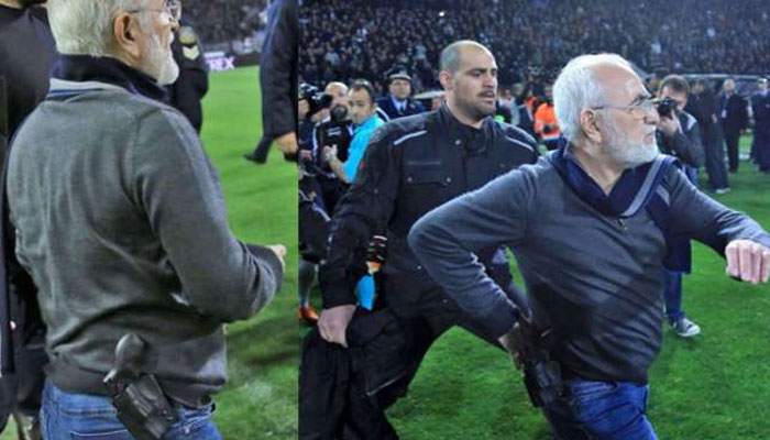 ഈ സമയത്ത് പി.എ.ഒ.കെ. ടീമുടമ ഇവാന് സാവിഡിസ് കീശയില് തോക്കുമായി ഗ്രൗണ്ടിലെത്തി. റഫറിയെ ചൂണ്ടി ഭീഷണിപ്പെടുത്തി ഗോള് അനുവദിപ്പിക്കാന് ശ്രമിച്ചു. ഇതോടെ കളി പൂര്ത്തിയാക്കാതെ എ.ഇ.കെ. താരങ്ങള് കളം വിട്ടു.