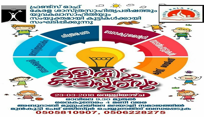 അബുദാബി: ഫ്രണ്ട്സ് ഓഫ് കേരള ശാസ്ത സാഹിത്യ പരിഷത്തും യുവ കലാ സാഹിതിയും ചേര്ന്ന് യു. എ. ഇ.യിലെ കുട്ടികള്ക്കു വേണ്ടി ഒരുക്കുന്ന എക ദിന ക്യാമ്പ് ‘കളിവീടും കുട്ടിപ്പൂരവും’ മാര്ച്ച് 23 രാവിലെ 9 മണി മുതല് 5 മണി വരെ അബുദാബി മുസ്സഫയിലെ മലയാളി സമാജത്തില് നടക്കും.