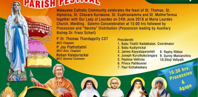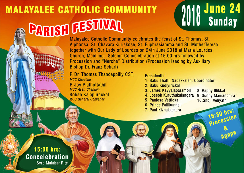 വിയന്ന: ഓസ്ട്രിയയിലെ മലയാളി കാത്തോലിക്ക സമൂഹത്തിന്റെ നേതൃത്വത്തിൽ വിശുദ്ധ തോമസ്ലീഹായുടെയും വിശുദ്ധ അൽഫോൻസാമ്മയുടെയും, വിശുദ്ധ ചാവറ കുറിയാകോസ് അച്ചൻ, വിശുദ്ധ യുഫ്രേസ്യയാമ്മ, വിശുദ്ധ മദർ തെരയുടെയും തിരുനാൾ പരിശുദ്ധ ലൂർദ് മാതാവിന്റെ തിരുനാളിനോട് കൂടി സംയുക്തമായി ആഘോഷിക്കും. വിയന്നയിലെ മൈഡിലിംഗ് ദേവാലയത്തിൽ ജൂണ് 24ന് (ഞായർ) ഉച്ച കഴിഞ്ഞ് മൂന്ന് മണിക്ക് ആഘോഷമായ വിശുദ്ധ കുർബാനയോടുകൂടി തിരുനാൾ തിരുകർമ്മങ്ങൾ ആരംഭിക്കും.