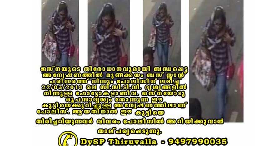 ജസ്നയെ അന്വേഷിച്ച് ബംഗളൂരുവിലും മൈസൂരിലും പൊലീസ് തെരച്ചില് നടത്തിയിരുന്നു. ധര്മാരാമിലെ ആശ്രമത്തിലും നിഹാംന്സ് ആശുപത്രിയിലും കണ്ടെന്ന വിവരത്തിന്റെ അടിസ്ഥാനത്തില് പൊലീസ് അന്വേഷണം നടത്തിയെങ്കിലും നിരാശയായിരുന്നു ഫലം. ഇതിനിടയിലാണ് മുണ്ടക്കയത് ഒരു തുണിക്കടയുടെ സിസിടിവി ദൃശ്യങ്ങളില് ജെസ്നയെ പോലീസ് കണ്ടെത്തിയത്. കാണാതായ ദിവസം തന്നെ ഉള്ളതാണ് ഈ ദൃശ്യം. വീട്ടില് നിന്നും ഇറങ്ങിയ സമയം ചുരിദാര് ധരിച്ചിരുന്ന ജെസ്ന ദൃശ്യങ്ങളില് ജീന്സ് പാന്റും ഷര്ട്ടുമാണ് ധരിച്ചിരിക്കുന്നത്.