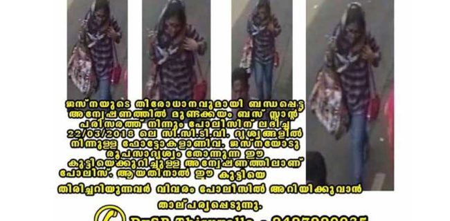 ജസ്നയെ അന്വേഷിച്ച് ബംഗളൂരുവിലും മൈസൂരിലും പൊലീസ് തെരച്ചില് നടത്തിയിരുന്നു. ധര്മാരാമിലെ ആശ്രമത്തിലും നിഹാംന്സ് ആശുപത്രിയിലും കണ്ടെന്ന വിവരത്തിന്റെ അടിസ്ഥാനത്തില് പൊലീസ് അന്വേഷണം നടത്തിയെങ്കിലും നിരാശയായിരുന്നു ഫലം. ഇതിനിടയിലാണ് മുണ്ടക്കയത് ഒരു തുണിക്കടയുടെ സിസിടിവി ദൃശ്യങ്ങളില് ജെസ്നയെ പോലീസ് കണ്ടെത്തിയത്. കാണാതായ ദിവസം തന്നെ ഉള്ളതാണ് ഈ ദൃശ്യം. വീട്ടില് നിന്നും ഇറങ്ങിയ സമയം ചുരിദാര് ധരിച്ചിരുന്ന ജെസ്ന ദൃശ്യങ്ങളില് ജീന്സ് പാന്റും ഷര്ട്ടുമാണ് ധരിച്ചിരിക്കുന്നത്.