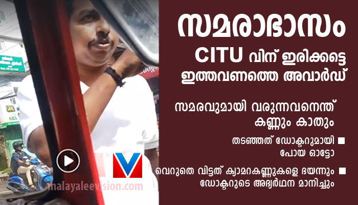 തിരുവനന്തപുരത്ത് ഡോക്ടറുമായി പോയ ഓട്ടോ തടഞ്ഞ് നിര്ത്തിയാണ് സമര ഭടന്മാര് പോരാടാന് ഇറങ്ങിയത്. ഡ്രൈവറോട് കയര്ത്തെങ്കിലും ക്യാമറ കണ്ണുകള്ക്ക് മുന്നില് ഉദ്യമത്തില് നിന്ന് പിന്തിരിഞ്ഞ CITU ജേഴ്സിയും ധരിച്ച് കളിക്കിറങ്ങിയ വീരനായ പോരാളിയെയും ഒപ്പമുള്ളവരെയും വീഡിയോയില് വ്യക്തമായി കാണാം. ക്യാമറ കണ്ണുകളെ ഭയന്നും, ഡോക്ടറുടെ നിരന്തര അഭ്യര്ത്ഥന മാനിച്ചും വെറുതെ വിടാനുള്ള വലിയ മനസ്സ് സമര ഭടന്മാര് കാണിച്ചെങ്കിലും ഇനി ഇതിലെ വന്ന് പോകരുതെന്ന താകീതും നല്കുന്നുണ്ട്.