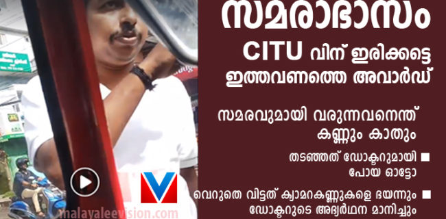 തിരുവനന്തപുരത്ത് ഡോക്ടറുമായി പോയ ഓട്ടോ തടഞ്ഞ് നിര്ത്തിയാണ് സമര ഭടന്മാര് പോരാടാന് ഇറങ്ങിയത്. ഡ്രൈവറോട് കയര്ത്തെങ്കിലും ക്യാമറ കണ്ണുകള്ക്ക് മുന്നില് ഉദ്യമത്തില് നിന്ന് പിന്തിരിഞ്ഞ CITU ജേഴ്സിയും ധരിച്ച് കളിക്കിറങ്ങിയ വീരനായ പോരാളിയെയും ഒപ്പമുള്ളവരെയും വീഡിയോയില് വ്യക്തമായി കാണാം. ക്യാമറ കണ്ണുകളെ ഭയന്നും, ഡോക്ടറുടെ നിരന്തര അഭ്യര്ത്ഥന മാനിച്ചും വെറുതെ വിടാനുള്ള വലിയ മനസ്സ് സമര ഭടന്മാര് കാണിച്ചെങ്കിലും ഇനി ഇതിലെ വന്ന് പോകരുതെന്ന താകീതും നല്കുന്നുണ്ട്.