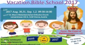 വിയന്ന സെന്റ് മേരീസ് മലങ്കര സിറിയന് ഓര്ത്തഡോക്സ് ദൈവാലയത്തില് എല്ലാവര്ഷവും നടത്തിവരുന്ന വെക്കേഷന് ബൈബിള് സ്കൂള് (VBS) ഈ വര്ഷവും സെന്റ് മേരീസ് സണ്ടെസ്കൂളിന്റെ നേതൃത്വത്തില് 2020 ആഗസ്റ്റ് 6, 7, 8 തിയതികളിലായി 4 മുതല് 17 വരെ പ്രായമുള്ള കുട്ടികള്ക്കായി ഓണ്ലൈനായി നടത്തുന്നതിനുള്ള ക്രമീകരണങ്ങള് ചെയ്തുവരുന്നു.