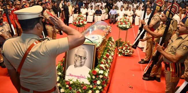 ആലപ്പുഴ: വി.എസ് അച്യുതാനന്ദന്റെ ഭൗതിക ശരീരം ആലപ്പുഴയിലെ വലിയ ചുടുകാട്ടില് സംസ്കരിച്ചു. പുന്നപ്രയിലെ വസതിയിലെയും സിപിഎം ജില്ലാ കമ്മിറ്റി ഓഫീസിലെയും റിക്രിയേഷന് ഗ്രൗണ്ടിലെയും പൊതുദര്ശനങ്ങള്ക്കു ശേഷമാണ് സംസ്കാര ചടങ്ങുകള്ക്കായി ഭൗതിക ശരീരം വലിയ ചുടുകാട്ടില് എത്തിച്ചത്. ഔദ്യോഗിക ബഹുമതികള്ക്കു ശേഷം മകന് അരുണ്കുമാര് ചിതയ്ക്ക് തീ കൊളുത്തി.