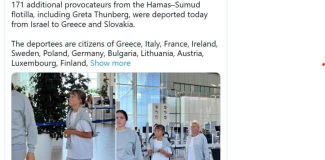 ആക്ടിവിസ്റ്റുകളേ ഗ്രീസിലേക്കും സ്ലൊവാക്യയിലേക്കും അയച്ചതായി ഇസ്രയേല് വിദേശകാര്യ മന്ത്രാലയം അറിയിച്ചു. നെഗേവിലെ റാമോണ് വ്യോമതാവളത്തില് നിന്ന് തുന്ബെര്ഗ് വിമാനത്തില് കയറിയതായി വിദേശകാര്യ മന്ത്രാലയ വക്താവ് പറഞ്ഞു. വിമാനത്താവളത്തില് നിന്നുള്ള തുന്ബെര്ഗ് അടക്കമുള്ളവരുടെ ചിത്രങ്ങളും പുറത്തുവിട്ടുണ്ട്.