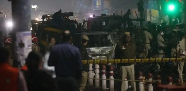 പ്രദേശത്ത് ഒരാളുടെ മൃതശരീരം ചിതറികിടക്കുന്നതിന്റെ ദൃശ്യങ്ങള് സമൂഹ മാധ്യമങ്ങളില് പ്രചരിക്കുന്നു. തീ പൂര്ണമായും അണച്ചുവെന്ന് അഗ്നിരക്ഷാ സേന അറിയിച്ചു. കാറിനു സമീപമുണ്ടായിരുന്ന നിരവധി പേര്ക്ക് പരിക്കേറ്റിട്ടുണ്ട്. പരുക്കേറ്റവരെ എല്എന്ജിപി ആശുപത്രിയിലേക്കാണ് മാറ്റിയത്.