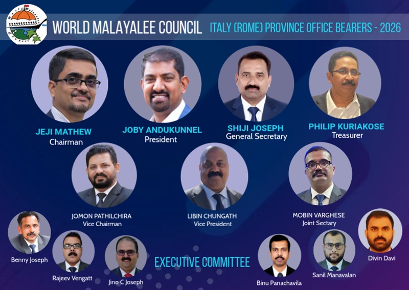 സംഘടനയുടെ മറ്റു ഗ്ലോബല് നേതാക്കളായ ബേബി മാത്യു സോമതീരം, മൂസ കോയ, ജോണി കുരുവിള, ഡോ. നടയ്ക്കല് ശശി, ചാള്സ് പോള്, മത്തായി സി. യു., തോമസ് ചെല്ലത്ത് തുടങ്ങിയവര് റോമിലെ പുതിയ ഭാരവാഹികളെ വേള്ഡ് മലയാളി കൗണ്സിലിന്റെ ഗ്ലോബല് കുടുംബത്തിലേക്ക് സ്വാഗതം ചെയ്തു.